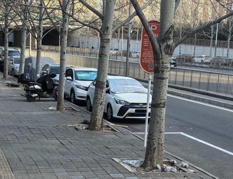 违停车辆故意避开路侧停车位。